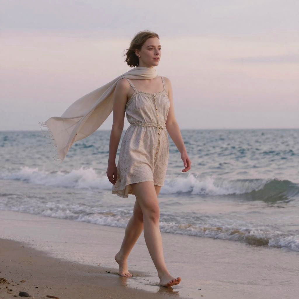 Anya Taylor-Joy walking along the shoreline of a peaceful beach, gentle waves, soft pastel sky, barefoot with a light flowing scarf, natural beauty, impressionist art style