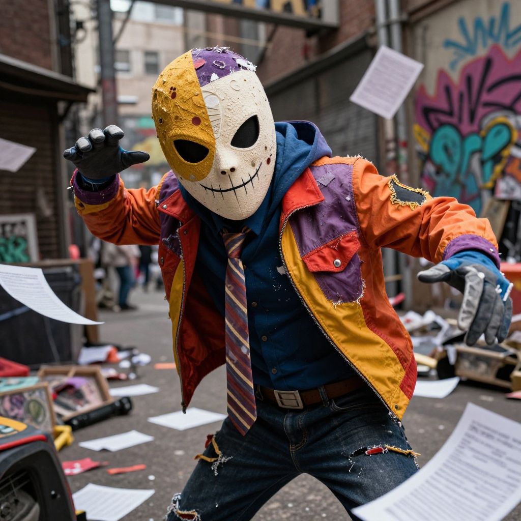 Mayhem guy costume in a chaotic urban street scene, vibrant colors and dynamic pose, detailed mask and torn jacket, surrounded by scattered papers and graffiti, dramatic lighting with shadows, cinematic style, high resolution close-up