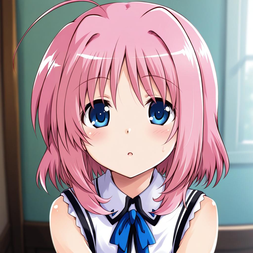 Caro ru lushe, lyrical nanoha, 1girl, blue eyes, pink hair, ahoge, by artist iwashi dorobou -r-, illustrious