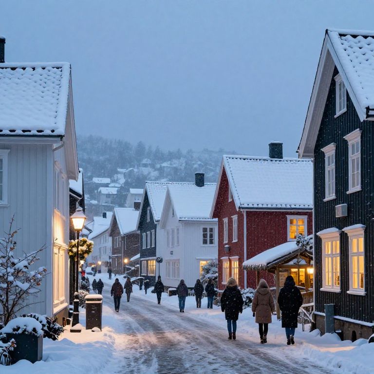 Winter scene in Solheim village, snow-covered rooftops and cobblestone streets, warm lit windows contrasting the cold blue twilight, villagers bundled in cozy clothing, soft snowfall adding a touch of tranquility, realistic digital art.