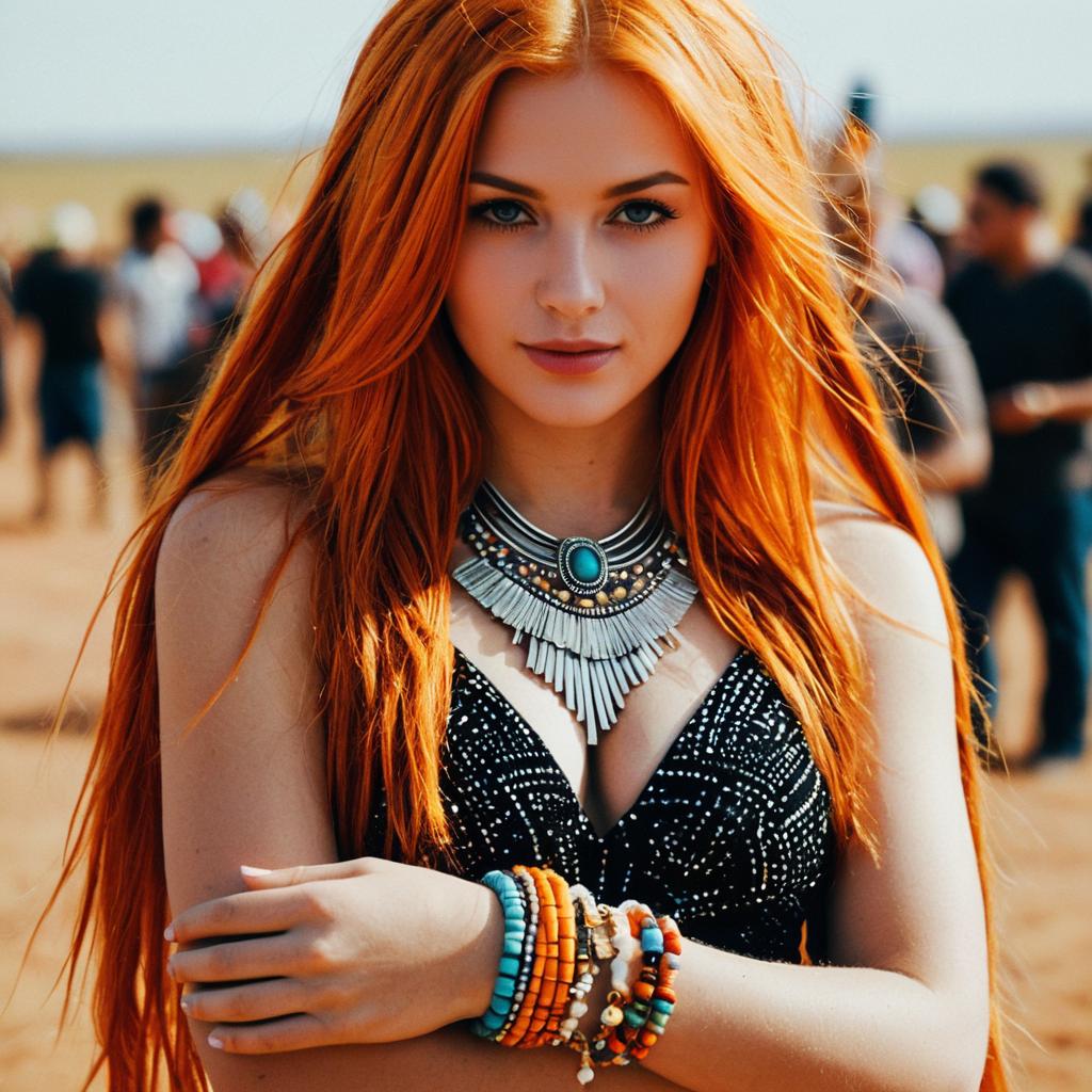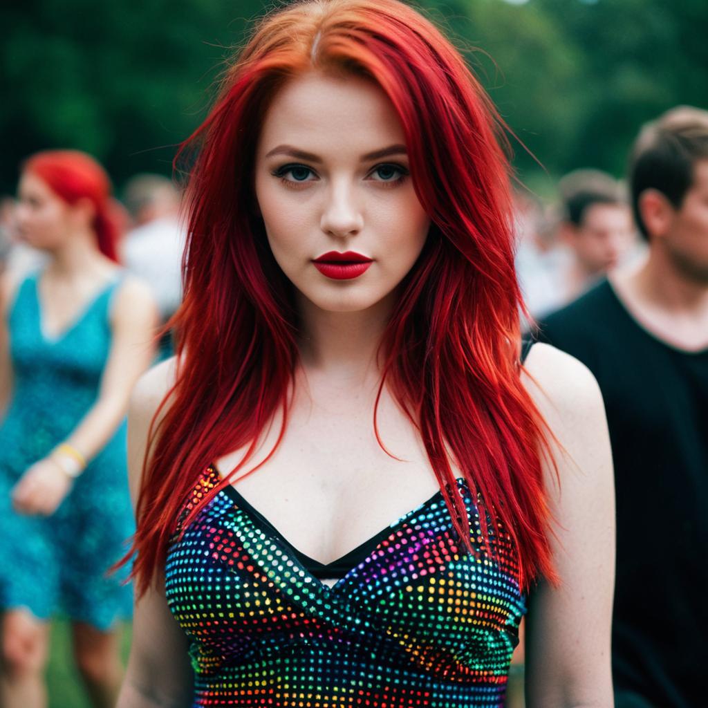 Portrait of a young woman with long red hair, green eyes, and fair skin standing outdoors with a blurred green background. She is wearing a red jacket with black trim, a green crop top, and green short shorts, exposing her midriff and navel. The image captures a realistic style with the woman looking directly at the viewer.