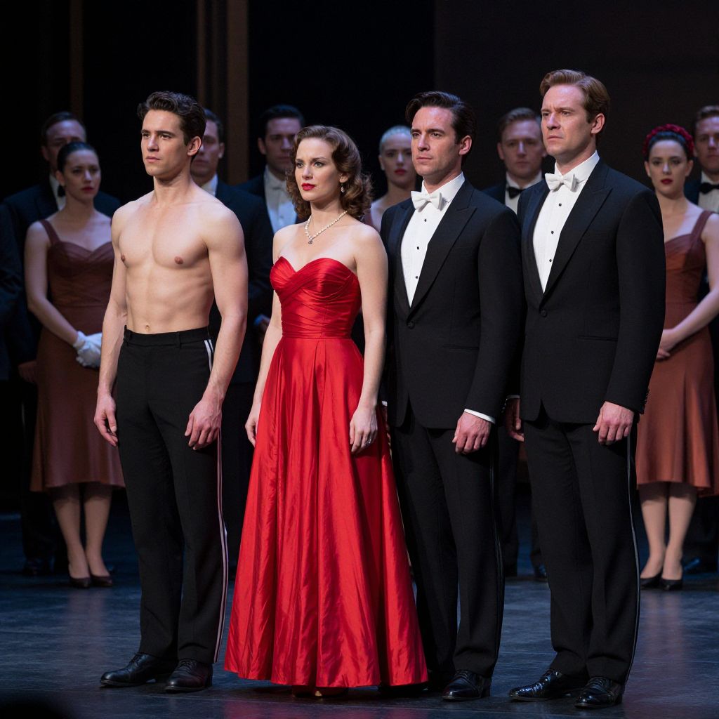 Photograph of a stage production: shirtless man in black pants, woman in red strapless gown, and two men in black tuxedos