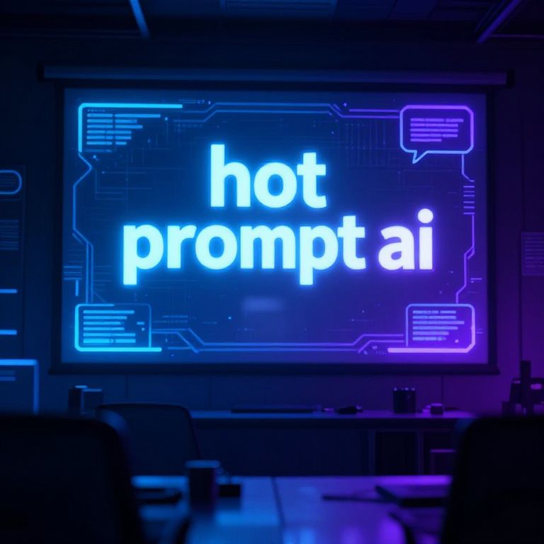 A mysterious AI research room with a large screen displaying the phrase 'hot prompt ai' in bold, futuristic letters, illuminated by blue and purple light, surrounded by holographic algorithms and thought bubbles.