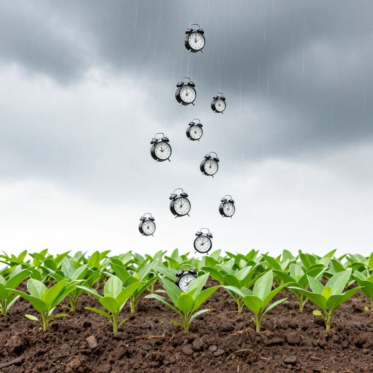 A surreal scene where a cascade of tiny, ticking alarm clocks descends from the sky like rain, embedding themselves into the earth and sprouting vibrant green plants, defying the boundaries between time and nature.