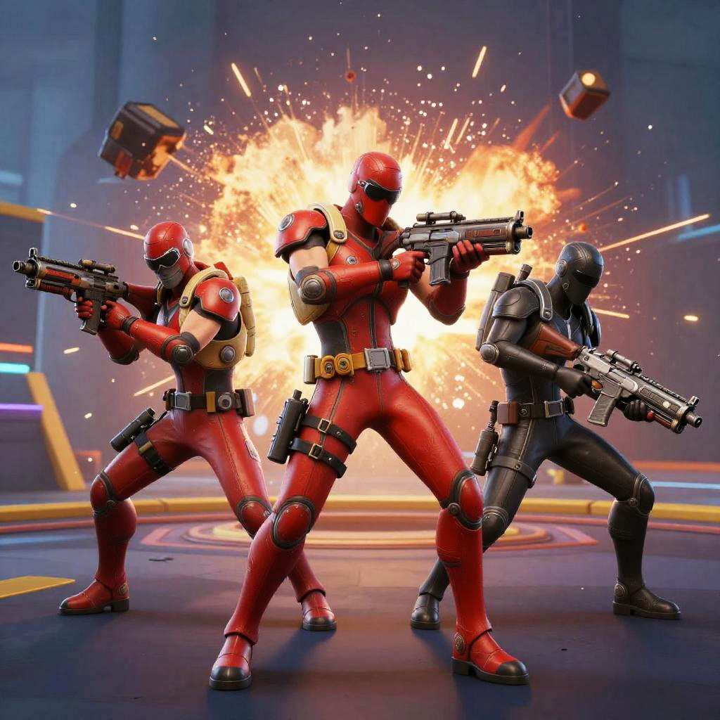 Photorealistic CGI image depicting four armored, masked commandos in a dynamic action scene. Three commandos in bright red suits, one in black, all holding assault rifles, stand in a combat-ready stance. The central red-suited commando fires their weapon, causing a dramatic explosion behind them, with fiery sparks and debris flying. The background is a futuristic, dimly lit industrial setting with blue and yellow lines on the floor. The red commandos wear black belts with gold buckles, and the black-suited commando has a similar outfit but with less visible details. The overall image conveys intense action and high-energy combat.