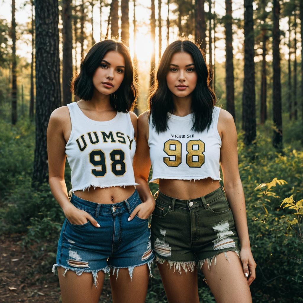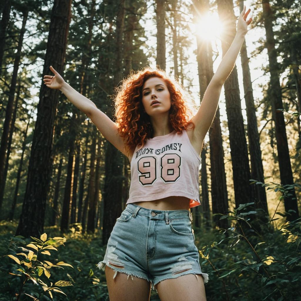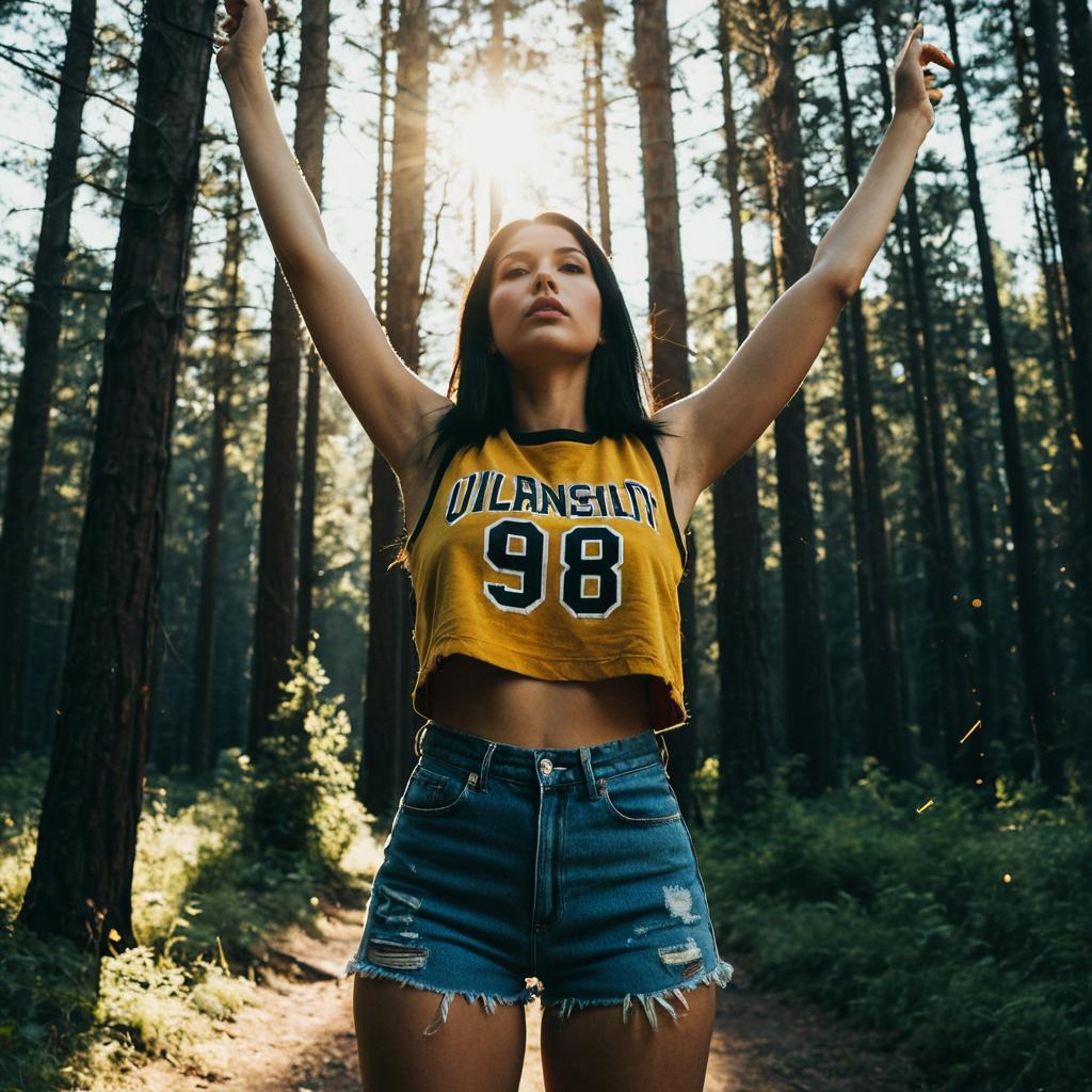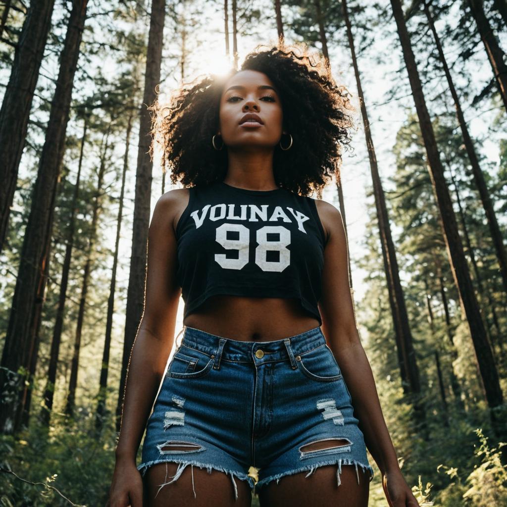 Woman wearing cropped varsity-number graphic tank top with raw frayed hem and distressed high-waisted denim shorts in red top with white 98 print and light distressed denim on blonde woman with loose beach waves posed looking over her shoulder with one leg slightly forward in edge of a forest with open sky behind, dramatic golden-hour backlighting with strong sun rays streaming through the trees, cinematic outdoor fashion photography, high resolution, ultra-detailed, realistic