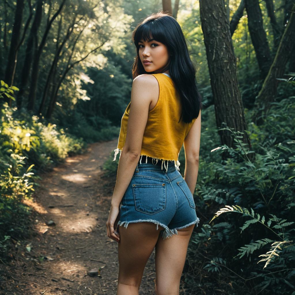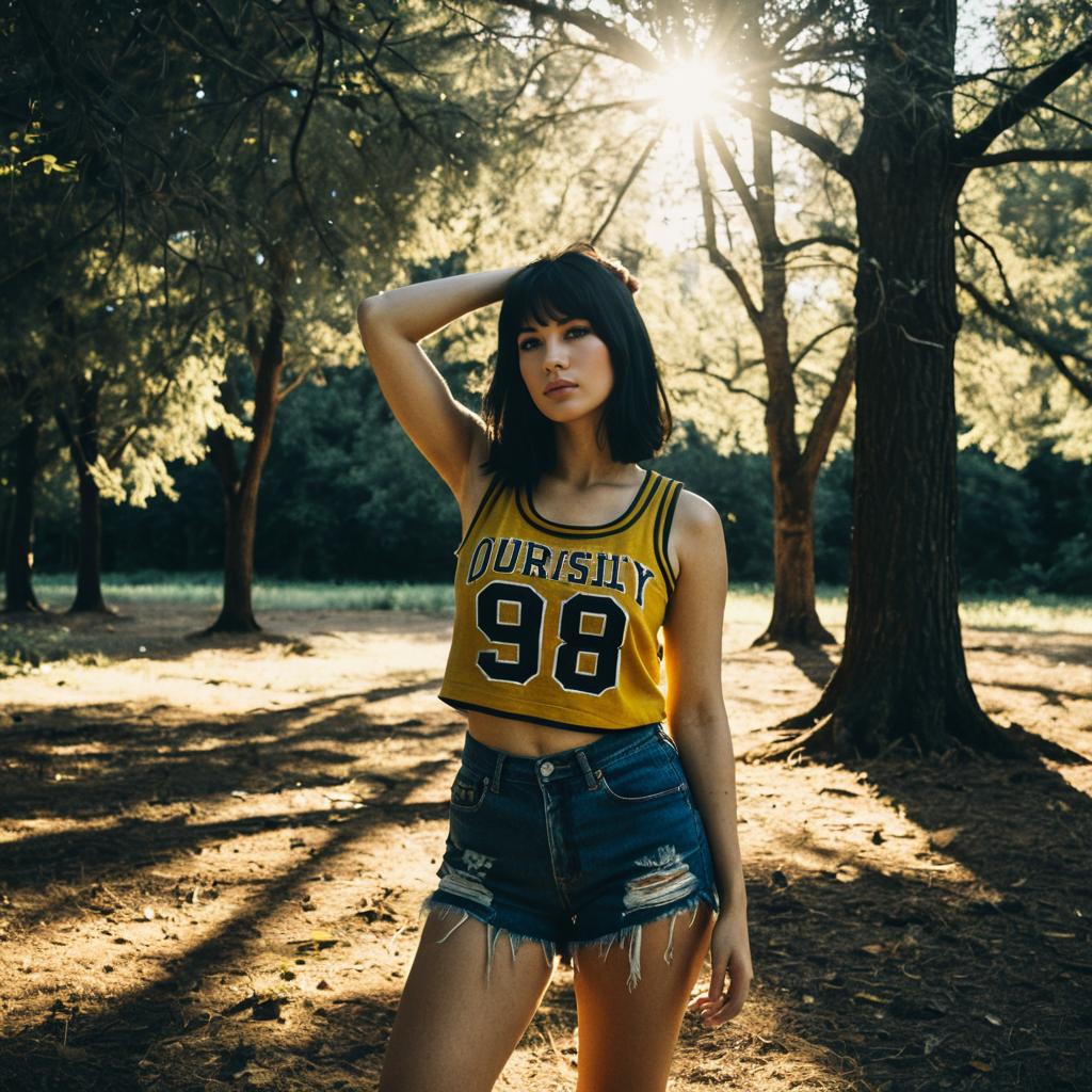 Blonde Woman in Red Varsity Tank and Denim Shorts in Forest