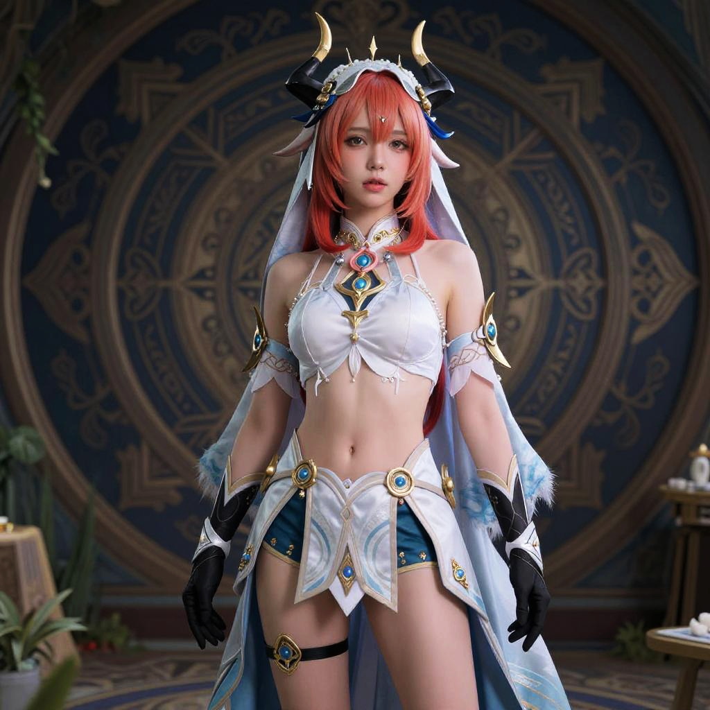 Ultra realistic 8k cg, masterpiece, ((ultra detailed background, delicate pattern, intricate detail)), (highly detailed, fine details), best quality, 1girl, (photorealistic:1.4), beautiful lighting, absurdres, RAW photo, film grain, nilou \(genshin impact\), solo, blush, bridal gauntlets, cape, detached sleeves, horns, jewelry, navel, parted lips, revealing clothes, thighs, ((slim girl, petite, small breasts, cowboy shot, forest environment, complex detailed background))