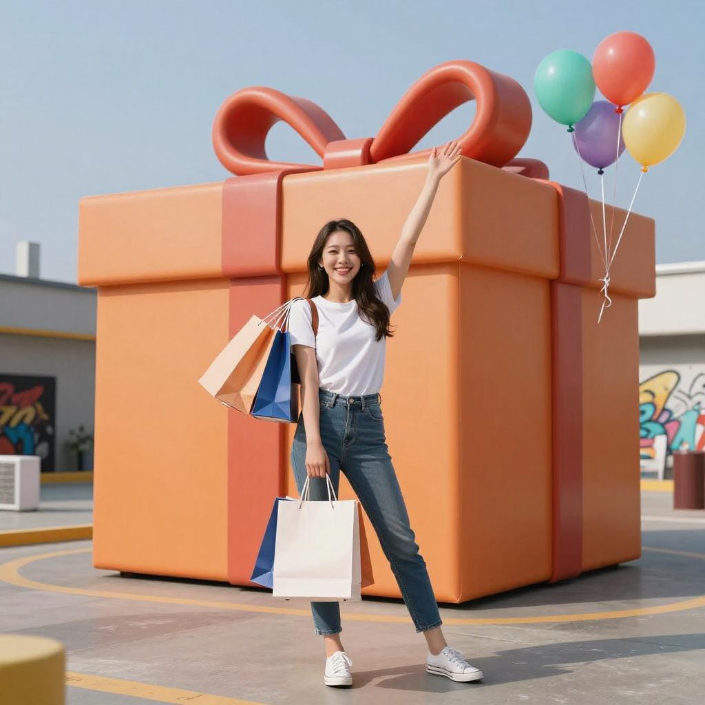 Graffiti Art TV advertisement, full body shot, wide shot, bright and clear, pretty Korean young woman, full-body, stylish streetwear, holding a lot of paper shopping bags, the girl bends one arm and raises it in front of my shoulder, a huge gift box the size of a person and balloons in the background, neon orange and pink, a toothy smile,