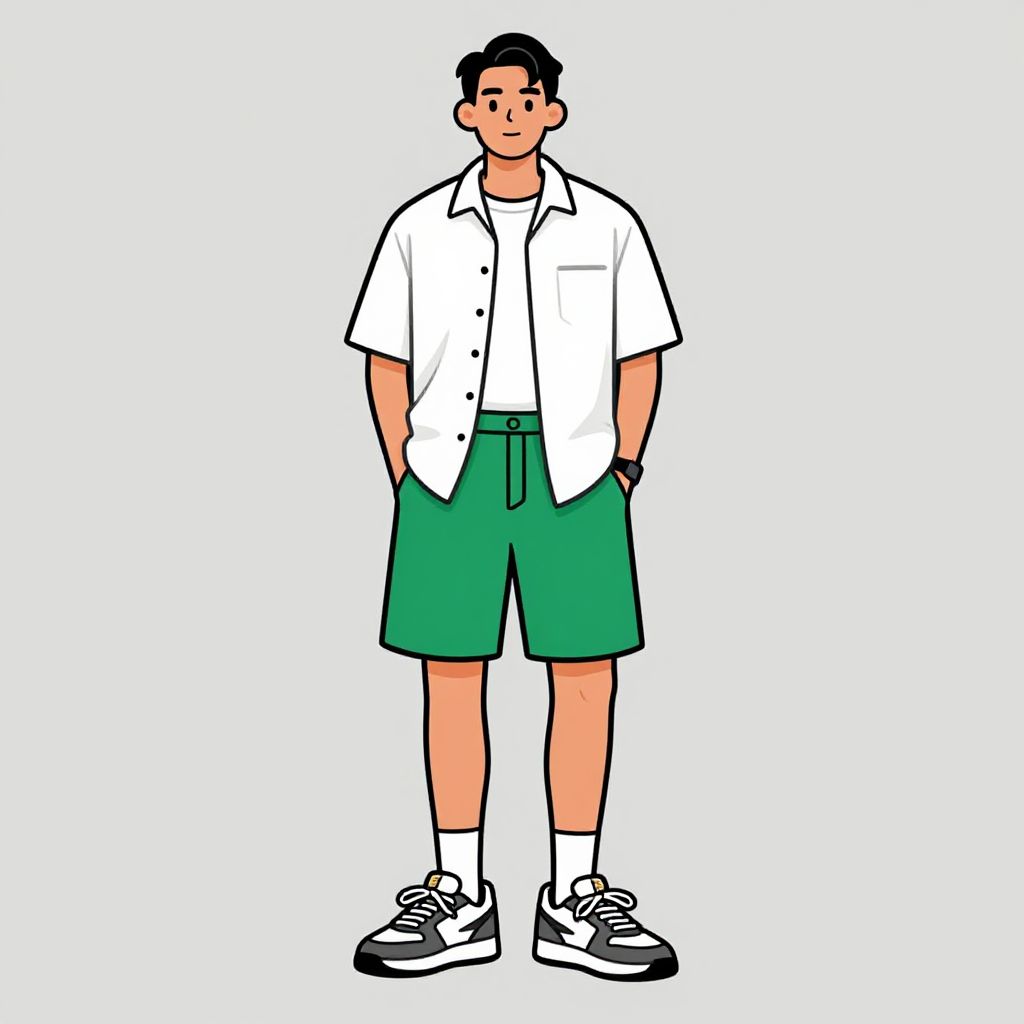 Digital drawing of a young man standing against a white background. He has short black hair, light skin, and a neutral expression. He wears a white short-sleeve button-up shirt, green knee-length shorts with a drawstring, white socks, and black and white sneakers. His hands are in his pockets, and he stands with a relaxed posture. The style is simple, with bold, black outlines and flat colors. The overall appearance is casual and unembellished, focusing on the subject's attire and stance.
