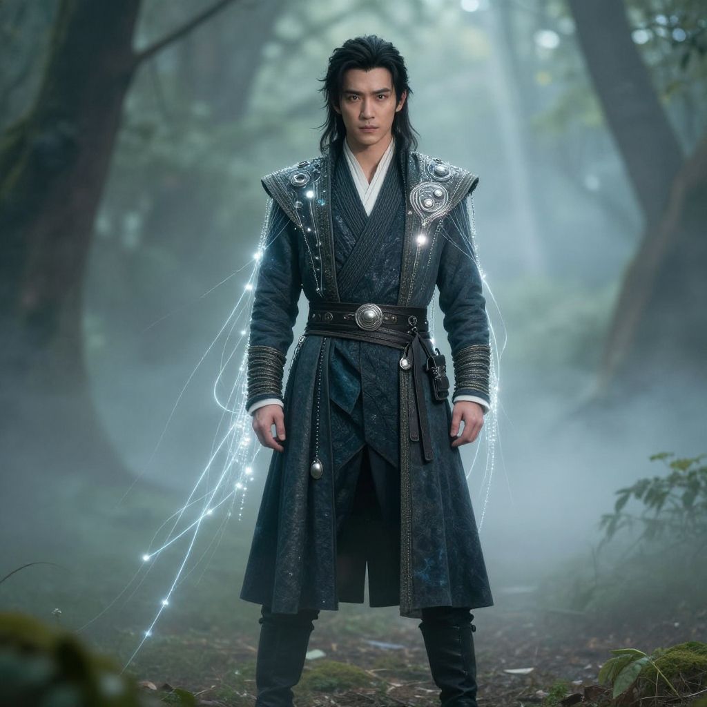 Outfit baps costume in a fantastical setting, combining historical elements and futuristic accents, with glowing threads and metallic embellishments, posed in a misty forest clearing illuminated by ethereal light beams.