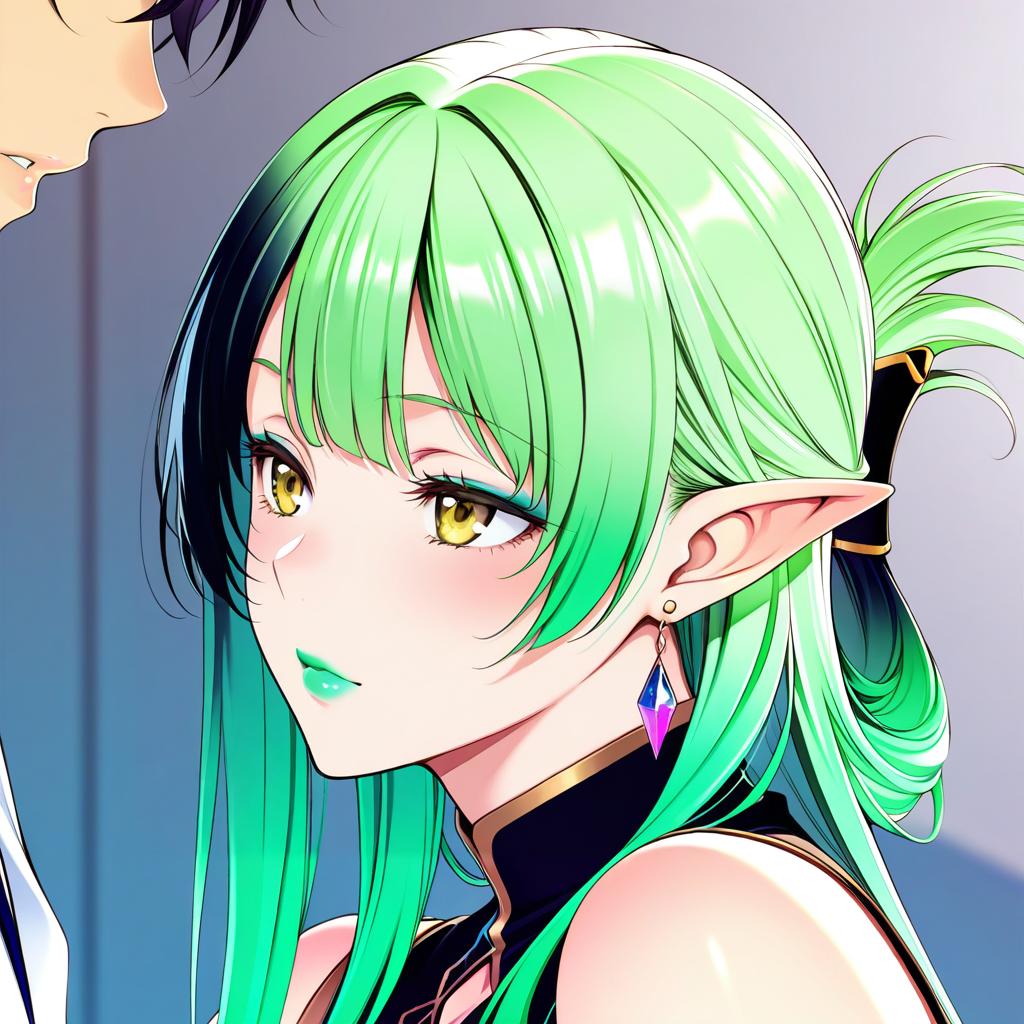 Hanabatake chaika, nijisanji, 1boy, green lips, pointy ears, yellow eyes, green eyeshadow, black hair, green hair, long hair, gradient hair, folded ponytail, virtual youtuber, virtual youtuber, earrings, elf, lipstick, by artist nanao (mahaya), illustrious