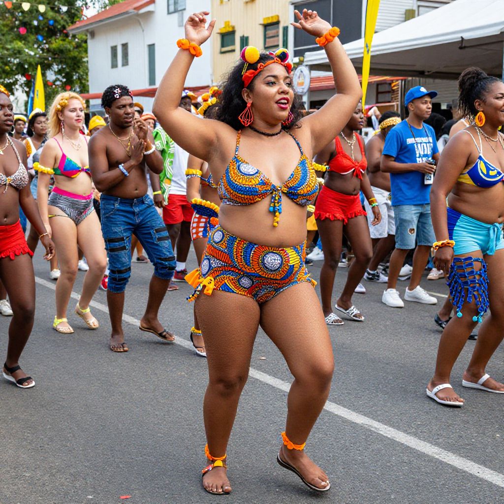 Photograph of a vibrant parade featuring a curvy, brown-skinned woman in a colorful, beaded bikini and orange accessories, dancing confidently in the