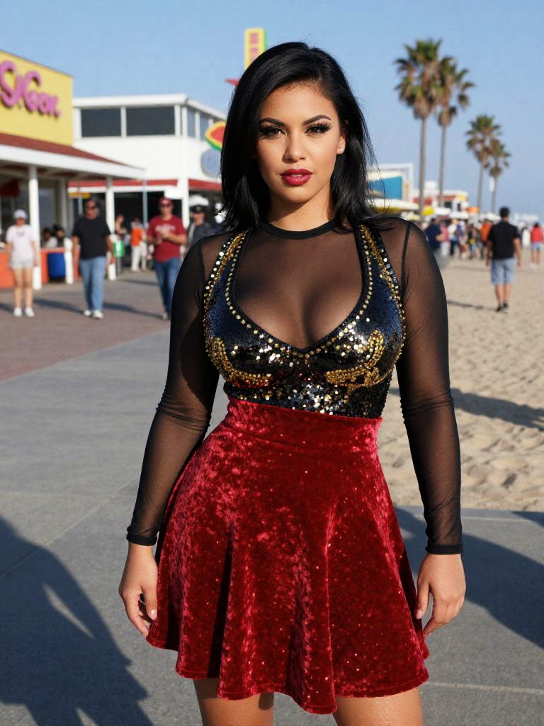 Photograph of a Latina woman with medium brown skin and straight black hair standing on a sunny beach boardwalk. She wears a sheer black long-sleeve top with gold sequins over the bust, exposing her cleavage, and a high-waisted, red velvet mini-skirt with a flared hem. Her makeup is bold with dark red lipstick. The background shows a crowded boardwalk with people, palm trees, and beachside buildings under a clear blue sky. The image has a slight digital enhancement effect, giving it a slightly exaggerated, glossy appearance.