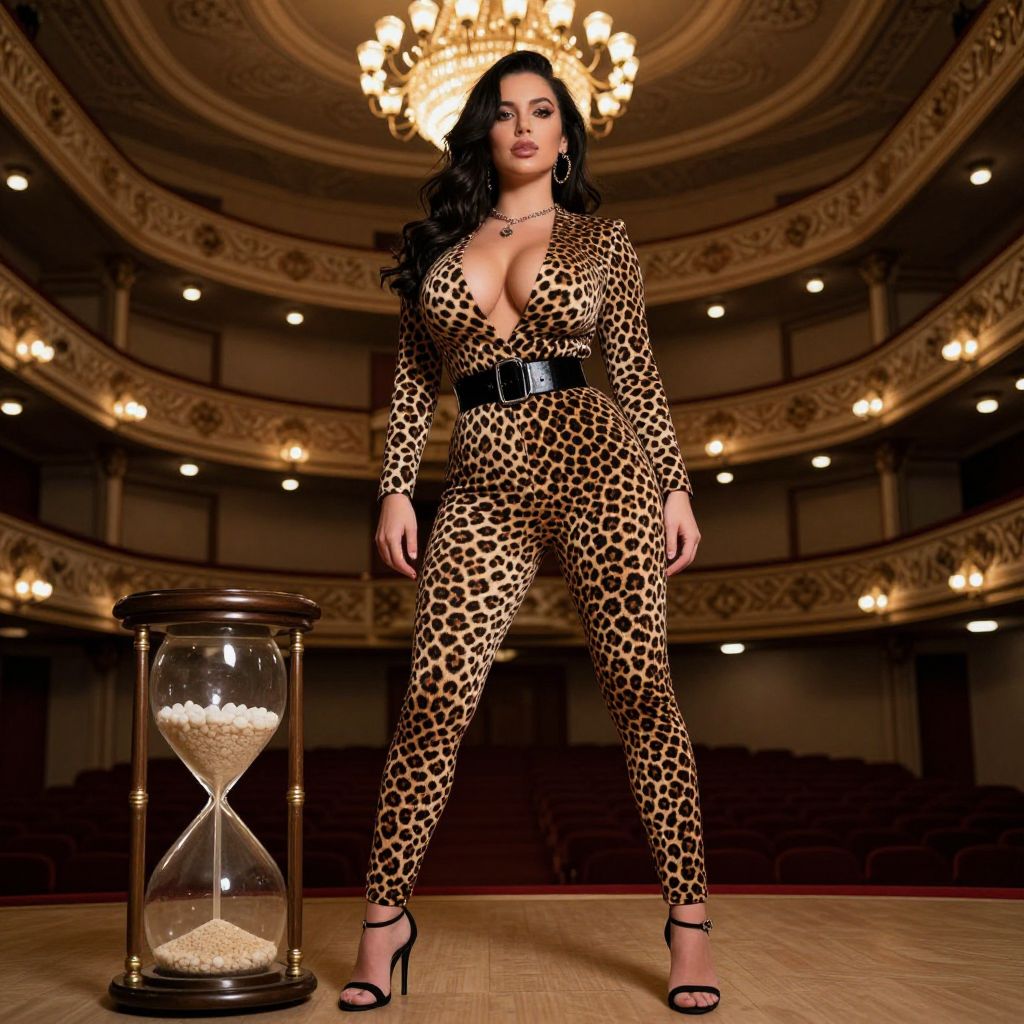 Photograph of a curvy woman with long black hair, wearing a tight, leopard-print jumpsuit with a deep V-neck, showcasing large breasts. She has a confident stance, standing in an opulent, dimly-lit theater with a grand chandelier overhead. She wears black high-heeled sandals and a black belt with a silver buckle. In front of her on the wooden stage is a large hourglass filled with sand. The theater's ornate balconies and rows of seats are visible in the background, creating a dramatic and luxurious setting.