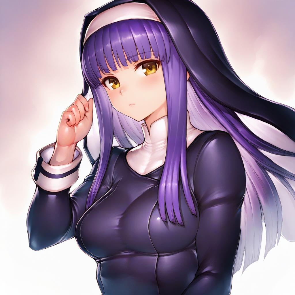 Asagami fujino, kara no kyoukai, 1girl, red eyes, purple hair, long hair, blunt bangs, reien girl's academy school uniform, reien girl's academy school uniform, long sleeves, habit, habit, by artist bob (biyonbiyon), illustrious