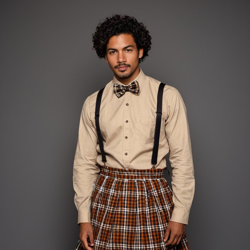 Photorealistic portrait of a young man with medium brown skin and curly dark brown hair, wearing a beige long-sleeve shirt paired with a brown plaid bow tie and matching full-length patterned skirt. He has black suspenders over his shirt and a trimmed mustache. The man is standing against a gradient gray background with a serious expression. The style is vintage with soft, slightly warm lighting.
