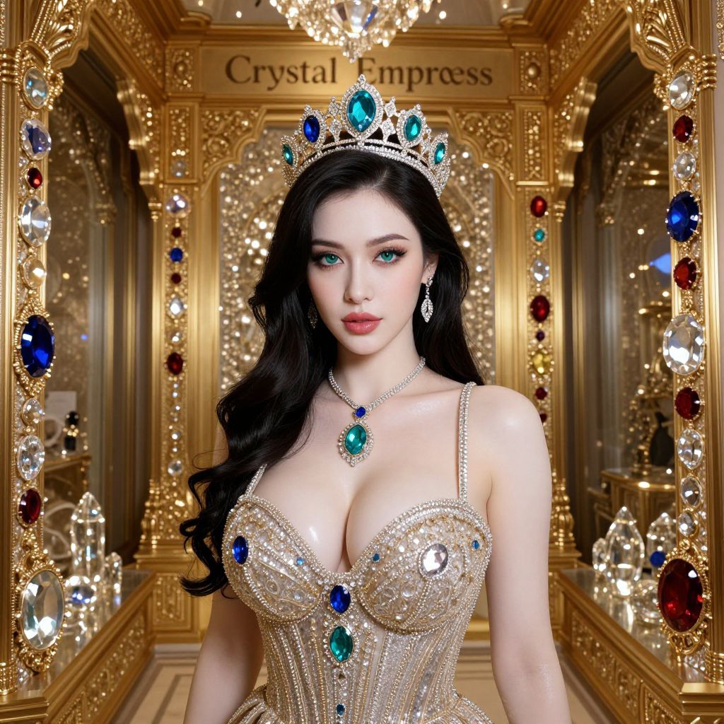 A regal woman with porcelain skin, high cheekbones, and deep emerald eyes stands in a luxurious gemstone vault, surrounded by glowing crystal empress decor — dazzling arrays of gemstones, including sapphires, rubies, and diamonds, reflecting under warm golden lighting, the phrase 'Crystal Empress' etched into the architecture of the chamber, showcasing the ultimate luxury shine.. The woman has big tits and cute face
