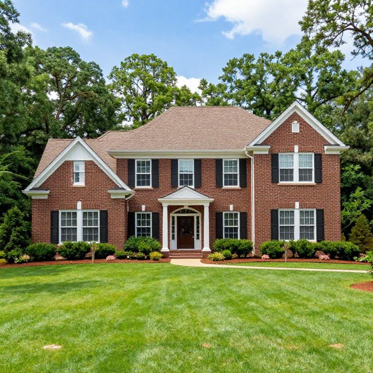 Photograph of a large, two-story brick colonial-style house with a steep, shingled roof. The house features white trim, black shutters, and multiple white-framed windows. The front has a centered, dark brown door with a small portico. A wide, well-manicured lawn extends in front, bordered by low, neatly trimmed bushes. Trees with dense green foliage fill the background under a bright blue sky with scattered white clouds. The overall appearance is classic and elegant, with a well-maintained, suburban setting.