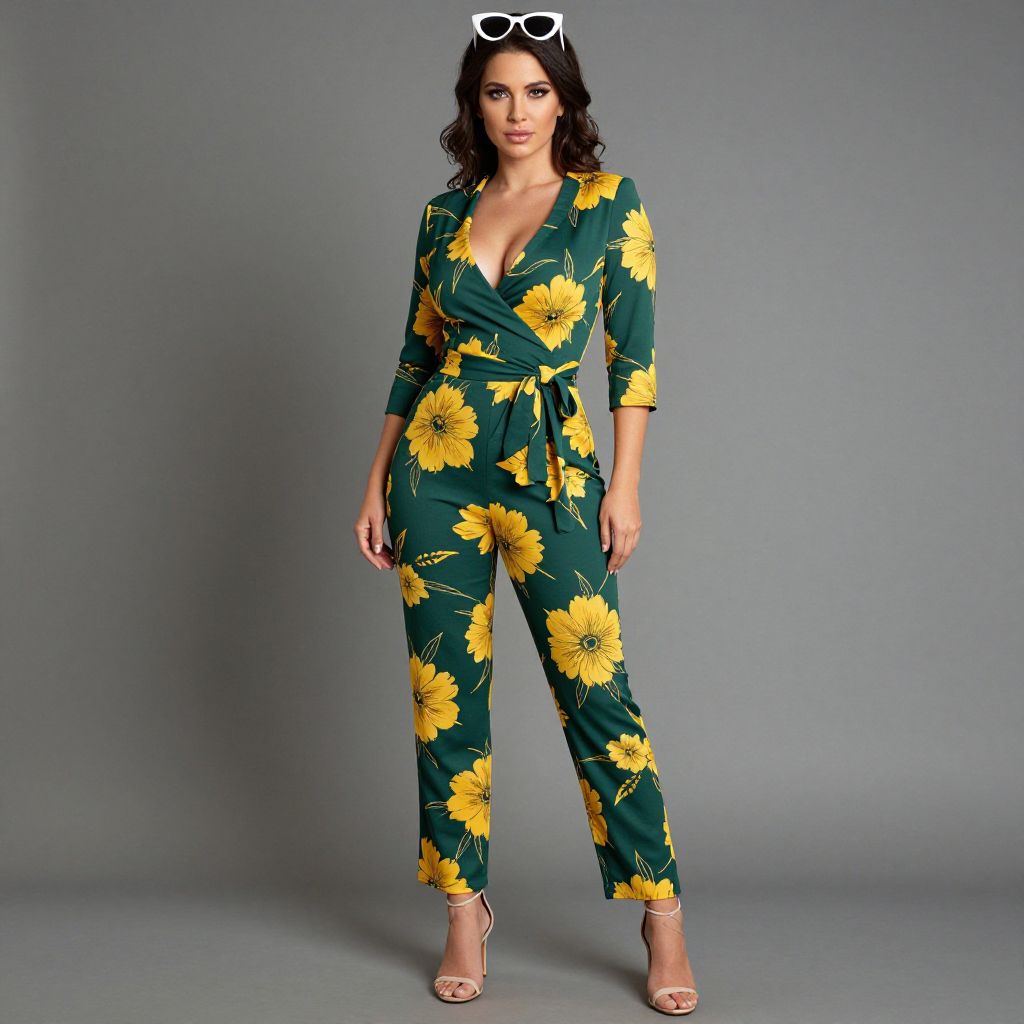 "Woman, bold print, tailored jumpsuit in forest green with large yellow floral patterns, three-quarter sleeves, wrap front with V-neck, tie waist, straight-leg pants, ankle length, white cat-eye sunglasses resting on head, strappy heeled sandals in a nude tone, gray studio background.. Sexy. Pretty face and beаutiful eyes. Big breasts."