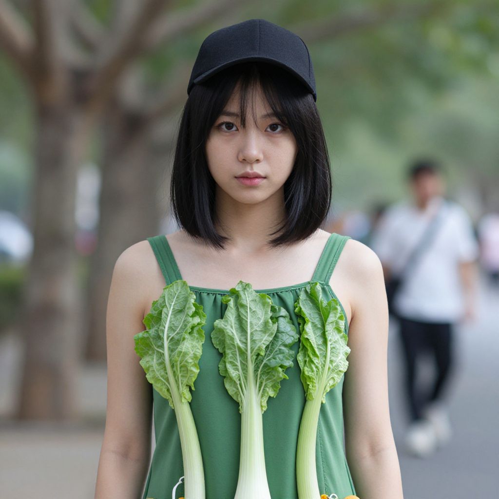 Young East Asian woman with black bob haircut and black cap, wearing a green dress with leafy vegetables, standing outdoors on a blurred street. Photoreal