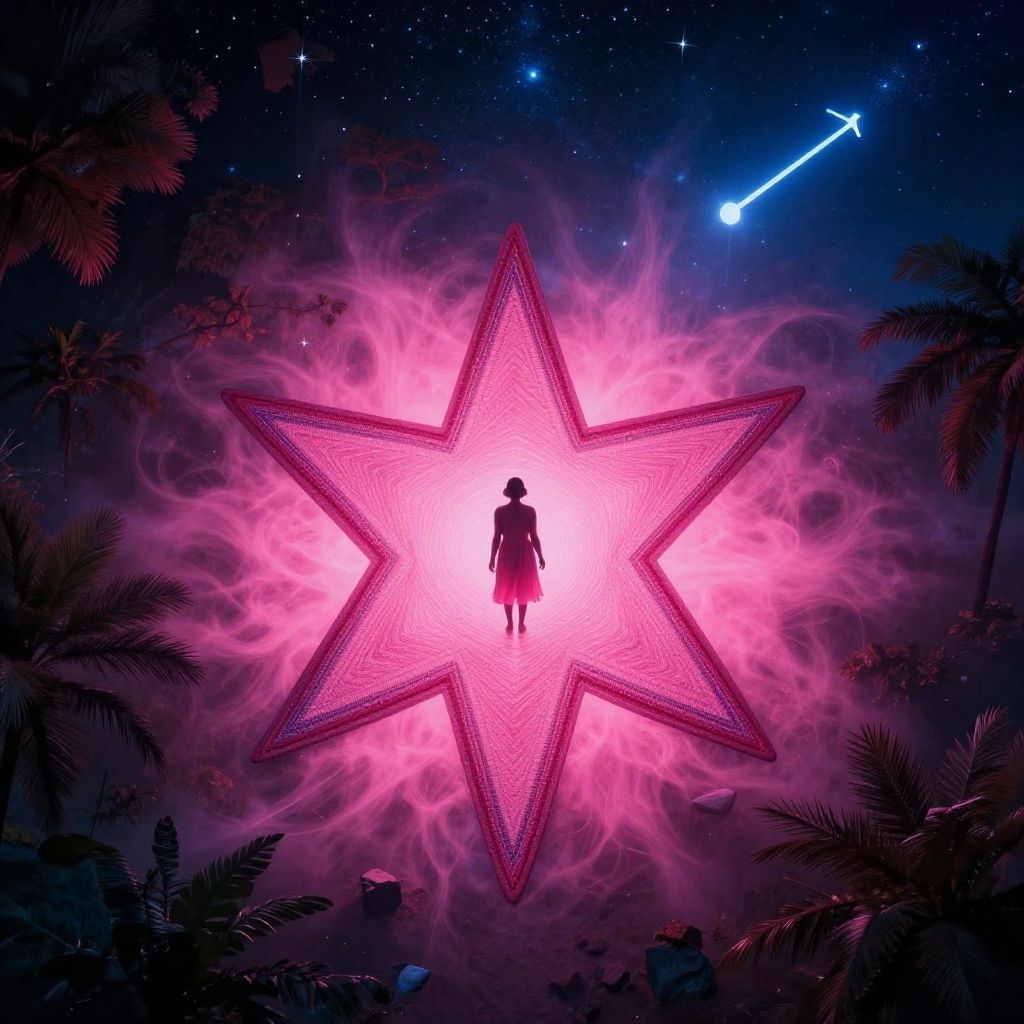 1girl, (by Aminollah Rezaei:1.3), abstract art, dark Raw digital photo, best quality, aerial shot of a traditional Senegalese ([Morning star|Yoga mat]:1.3), the Morning star is very Intuitive and Magical, it is with Rust embroidery, it is in a Sci-Fi setting, Star background, British foliage and Big Dipper in background, at Blue hour, Very wide view, Ultrarealistic, Disgusting, Tonalism, short lighting, Cinematic, Fujicolor Pro 400H, Selective focus, Vibrant Color, dynamic composition, Pink palette, extremely hyper aesthetic, extremely beautiful, asymmetrical