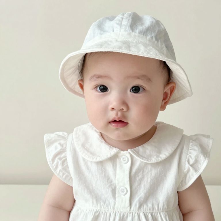 Asian baby boy with short hair and wearing a peach shirt with ruffles on the shoulders.