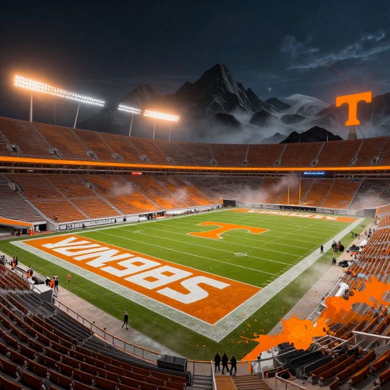 Cool Tennessee Vols wallpaper with a futuristic stadium scene illuminated by bright orange floodlights, a large vivid Volunteers logo on the field, surrounded by swirling smoky mountain mist and abstract paint splashes in contrasting colors creating dynamic depth.