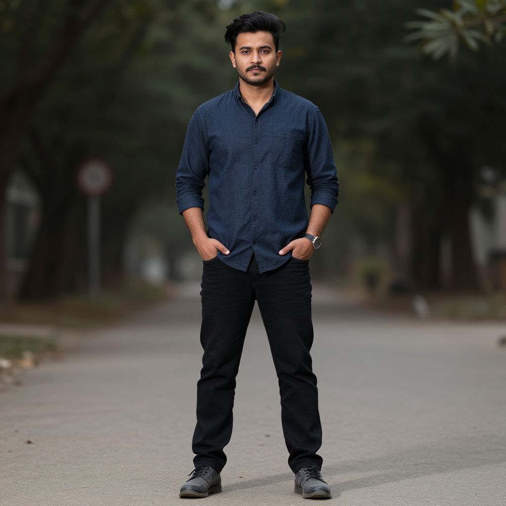 Photograph of a young South Asian man standing confidently on a deserted, tree-lined street. He has a medium build, short black hair, and a trimmed beard. He wears a dark blue, button-up shirt with sleeves rolled to his elbows, black pants, and black shoes. His hands are in his pockets. The background is blurred, featuring dark green trees and a faint road sign on the left. The street is paved and empty, creating a sense of solitude. The lighting is natural, highlighting his facial features and clothing. The overall mood is casual and self-assured.