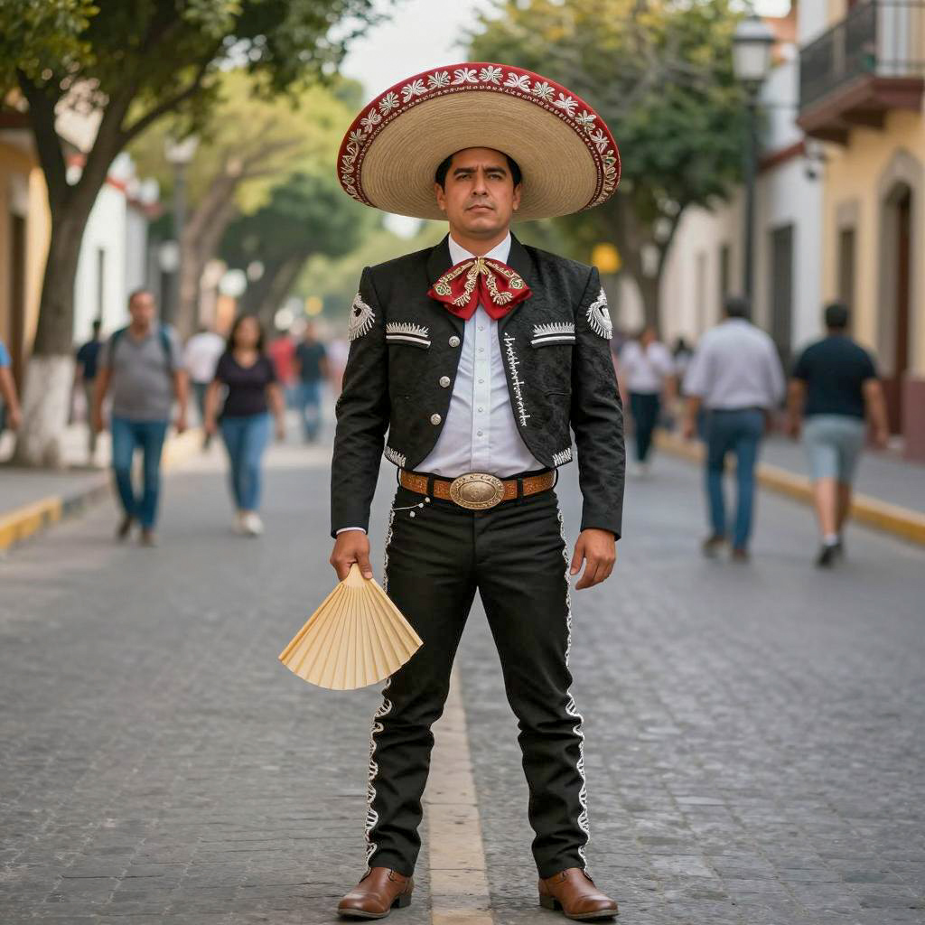 Mariachi costume male, photograph of a man in traditional Mexican mariachi outfit, standing in a sunny urban street, large colorful sombrero, black lace jacket with silver fringe, white ruffled shirt, brown belt with ornate buckle, black pants, brown boots, holding a fan, trees lining the street in background, people walking in the distance, afternoon light, slightly blurred background, realistic style, vibrant colors, detailed ures, full-body portrait, centered subject, street scene