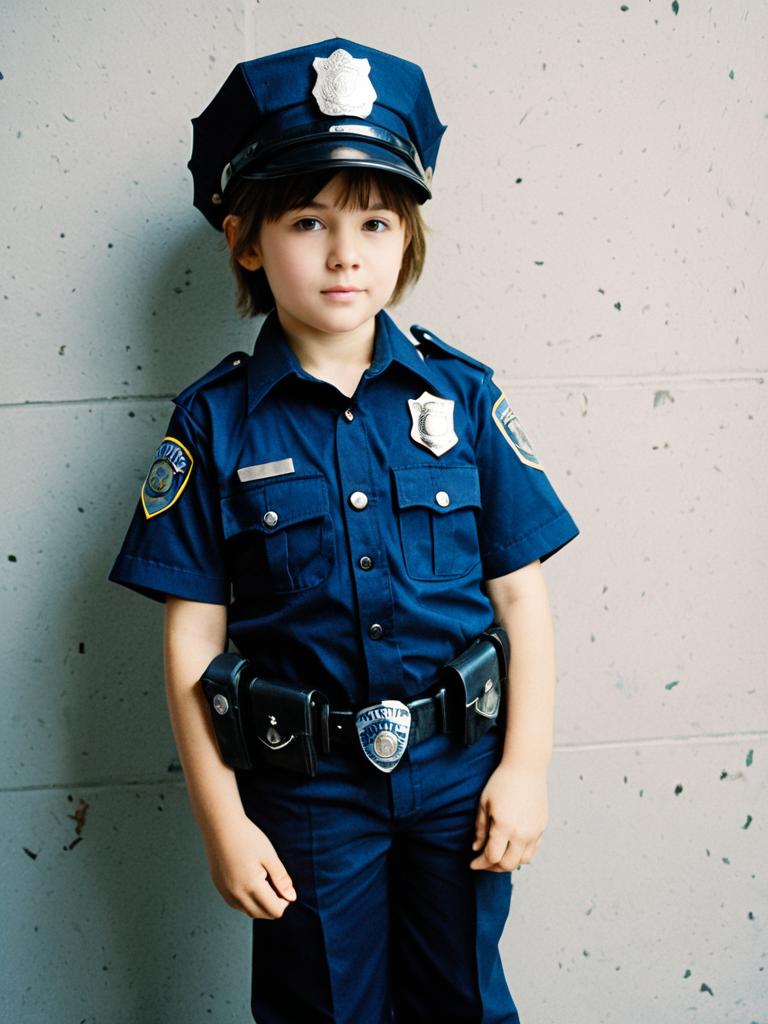 Child in Police Officer Costume, full-body cosplay photo with badge and hat