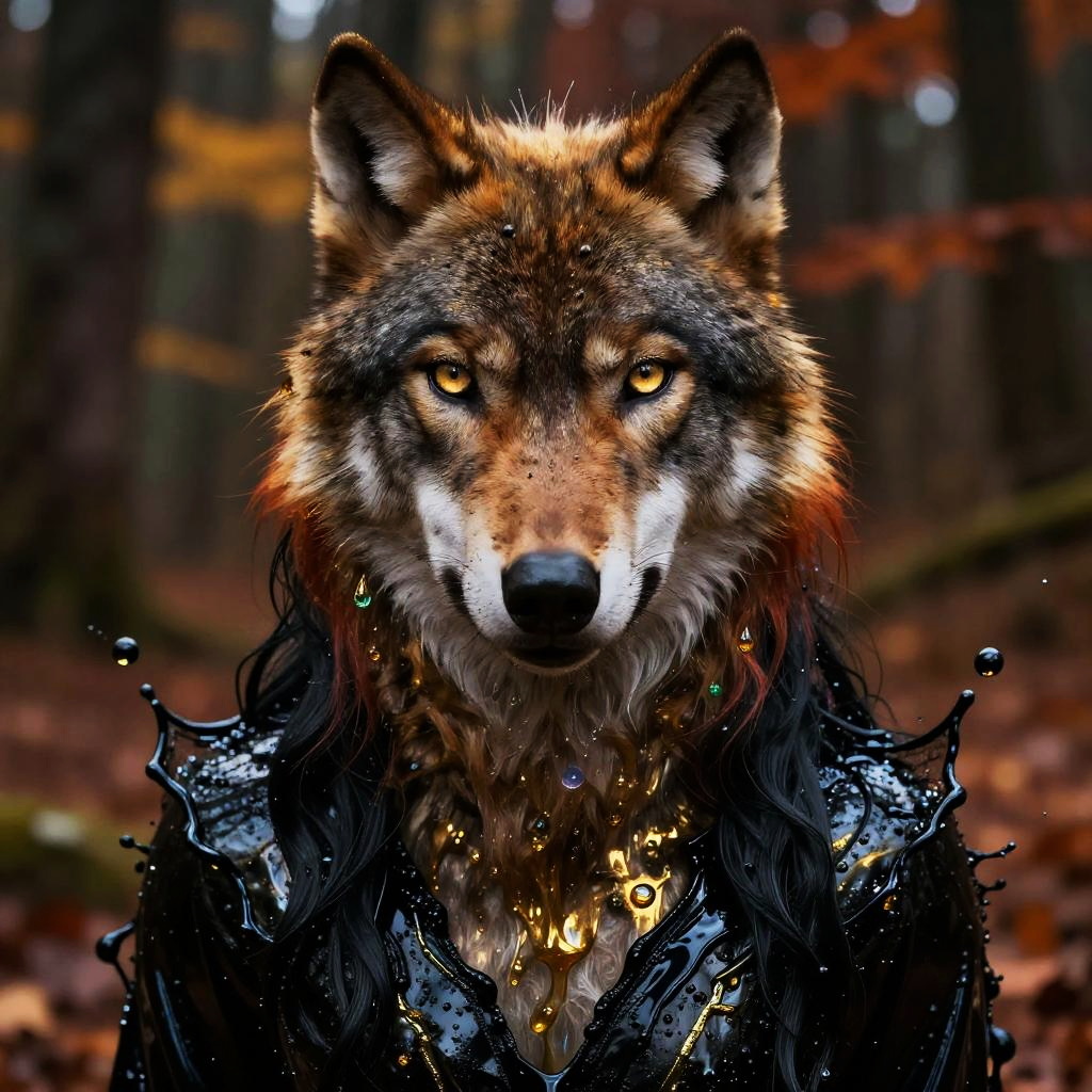 (close-up front view:1.8), dark gold theme, psychedelic, dark noir style, (((detailed portraite of a wolf+autumn forest))), red hair, symmetry eyes and iris, long black hair, in black liquid oil dress, huge liquid black oil splash and droplets, colorful, luminism, bioluminescence, studio lighting, hyper detailed, (masterpiece, best quality:1.4), ray tracing reflection, sharp focus, shallow depth of field detailed background, (ultra realistic:1.2), 16k resolution.