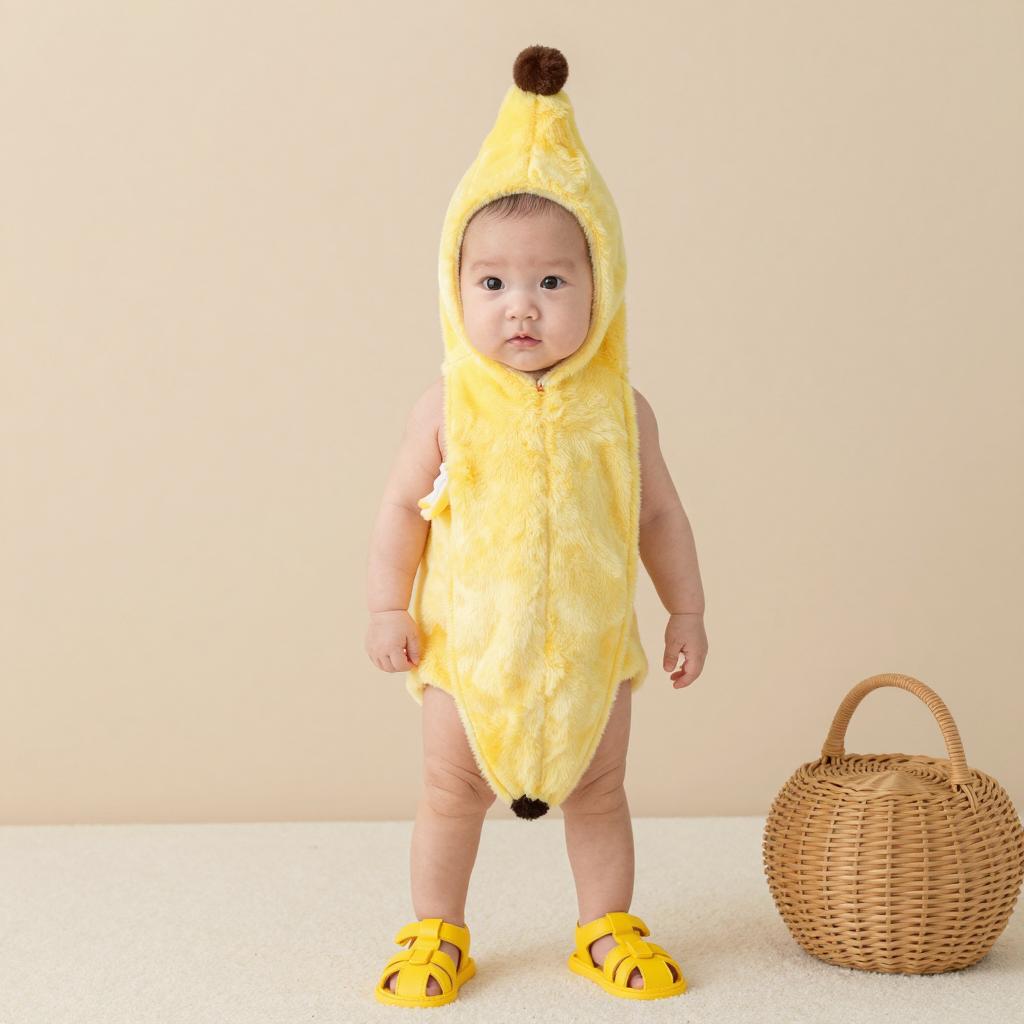 Infant peep costume, photograph of a baby wearing an orange onesie with a hood that has a pointed top, baby has wide eyes and neutral expression, baby standing in front of a plain white background, soft and plush ure of the onesie, baby's hands in pockets, bright orange color, studio lighting, realistic, clear focus, baby-centered, simple background, infant fashion, adorable, front view