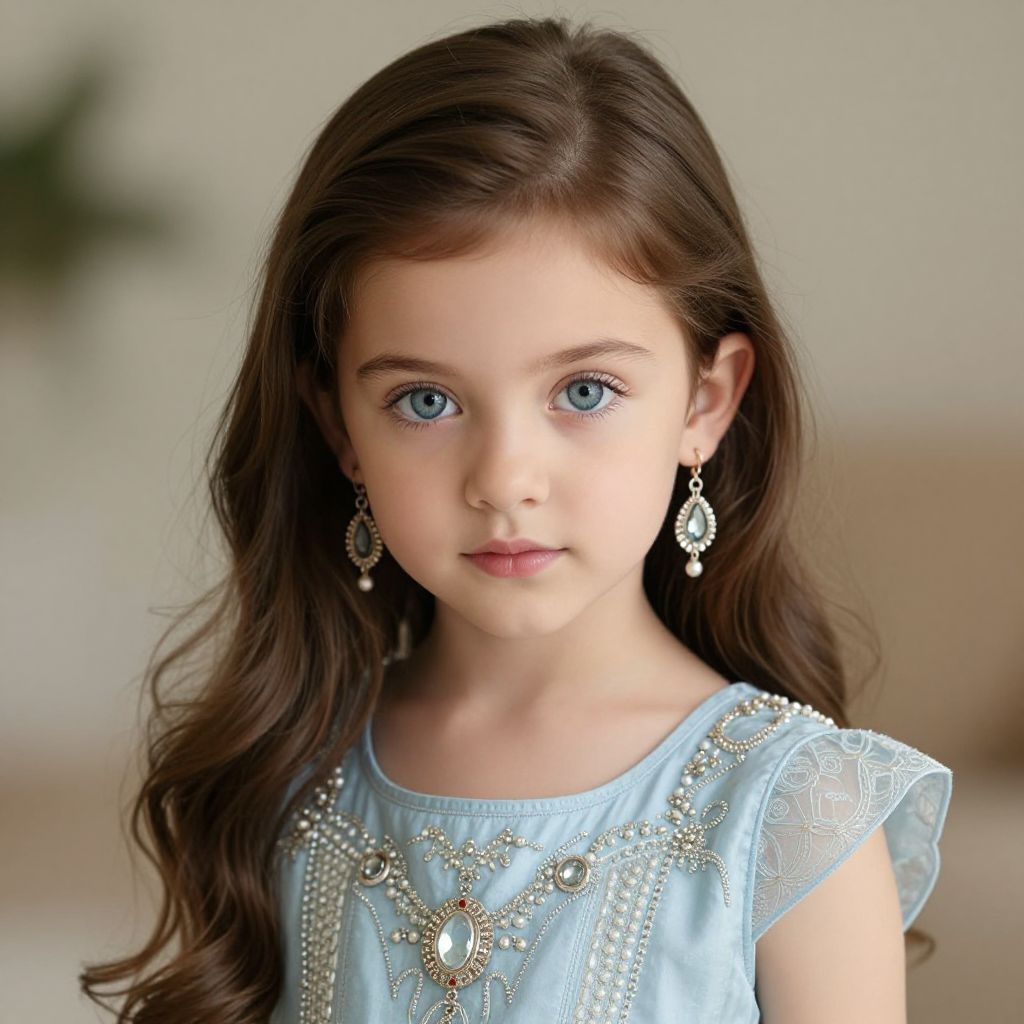 Infant princess jasmine, 1girl, solo, long hair, jewelry, blue eyes, looking at viewer, earrings, brown hair, dress
