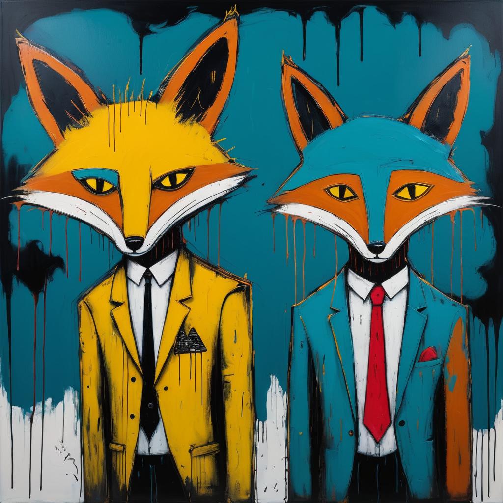 A surrealist oil painting in the style of Jean-Michel Basquiat, featuring somber foxes. A blend of colors creates a mysterious, introspective atmosphere, filled with dynamic scribbles that showcase the talents of an emerging creator.