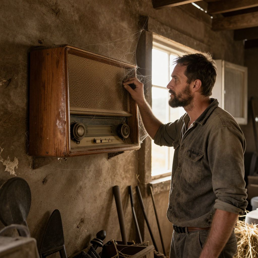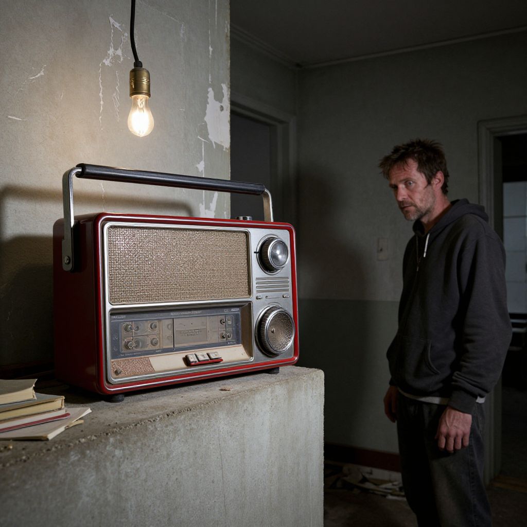 A large, retro-style radio with red and silver accents standing on a concrete basement wall, illuminated by a single flickering bulb, a man with a weathered face and a hoodie standing in shadow, the room looking like an abandoned old house with peeling paint and dusty books