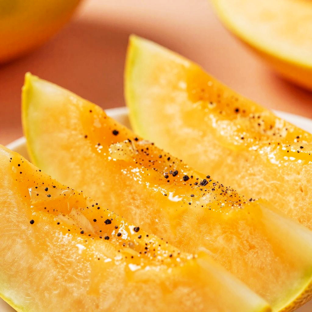This is a close-up photograph of bright orange, slightly translucent slices of fruit, possibly mango or cantaloupe, sprinkled with black pepper. The slices have a smooth, juicy texture, and the background is a soft, blurred mix of red and yellow, adding a vibrant contrast. The image has a high level of saturation, making the colors pop.