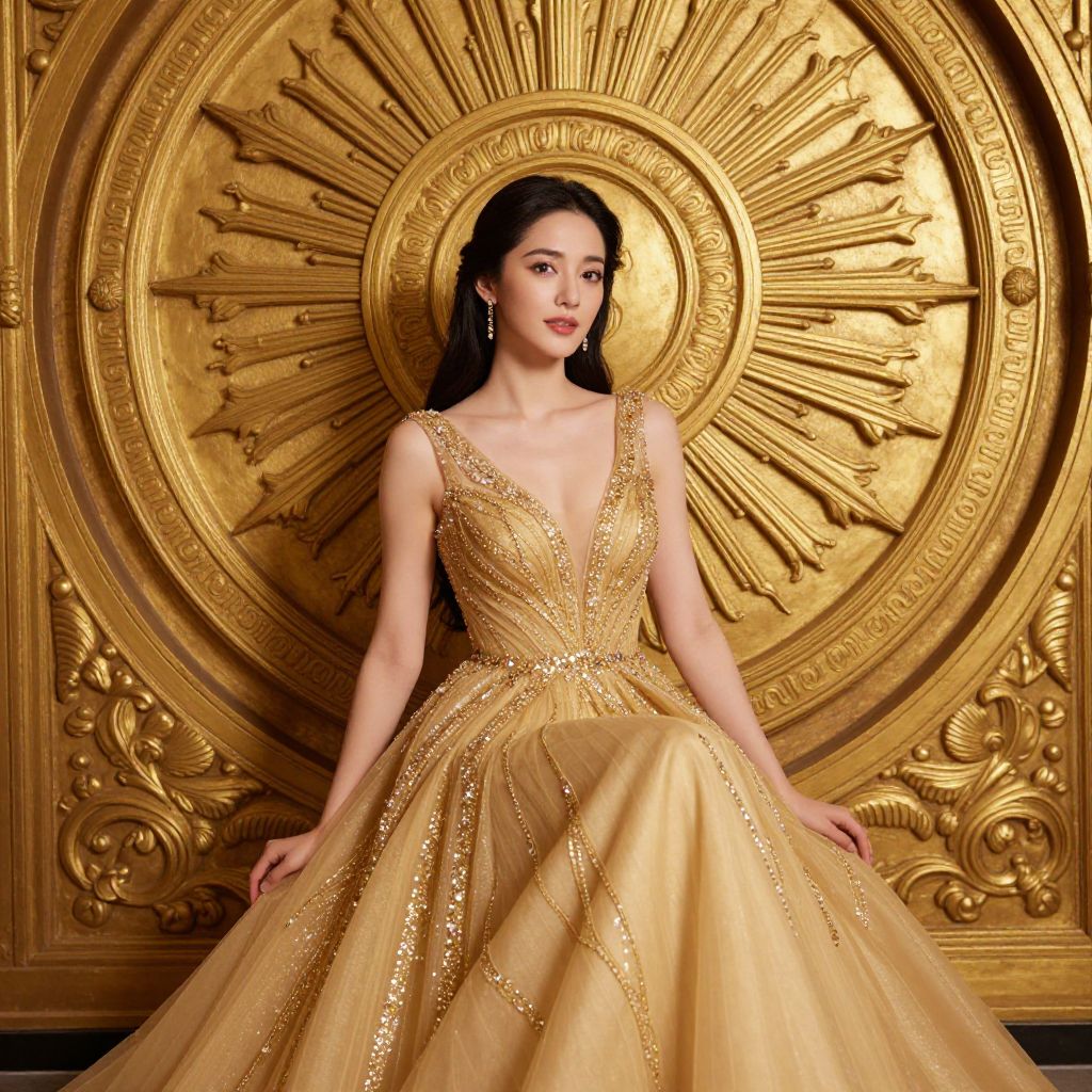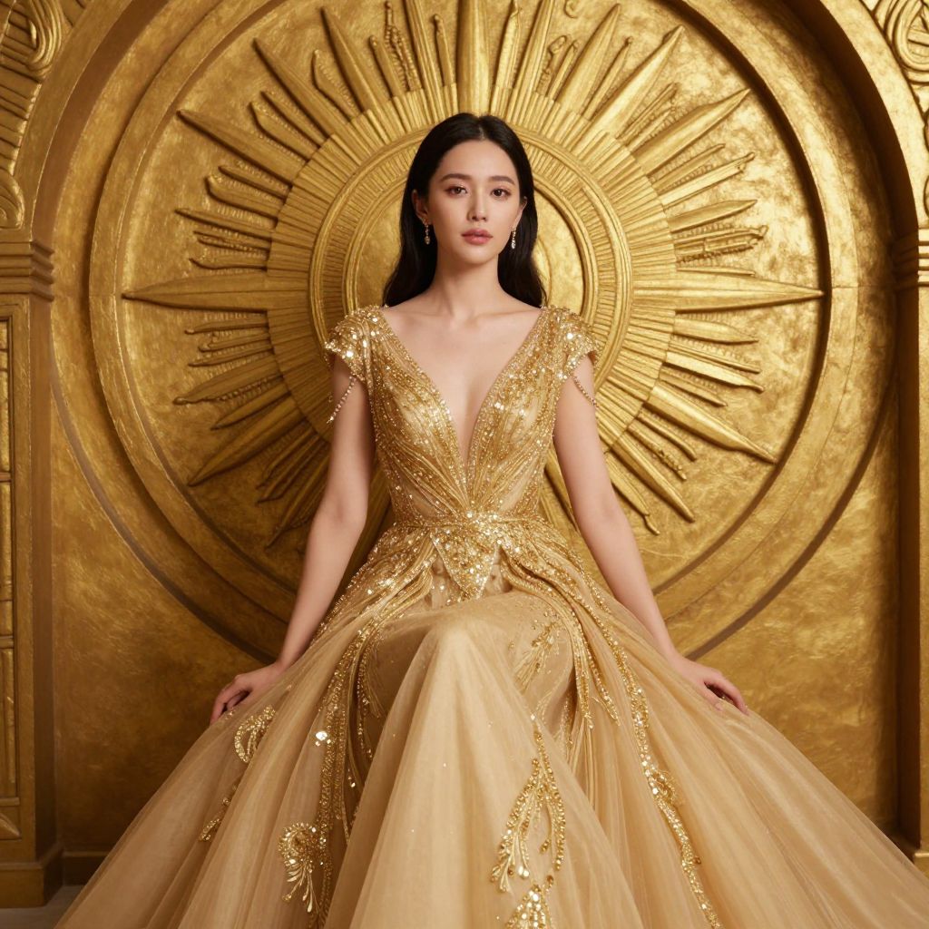 Elegant woman seated in a golden gown, adorned with sparkling embellishments, positioned against a richly detailed circular gold backdrop featuring intricate sunburst patterns.