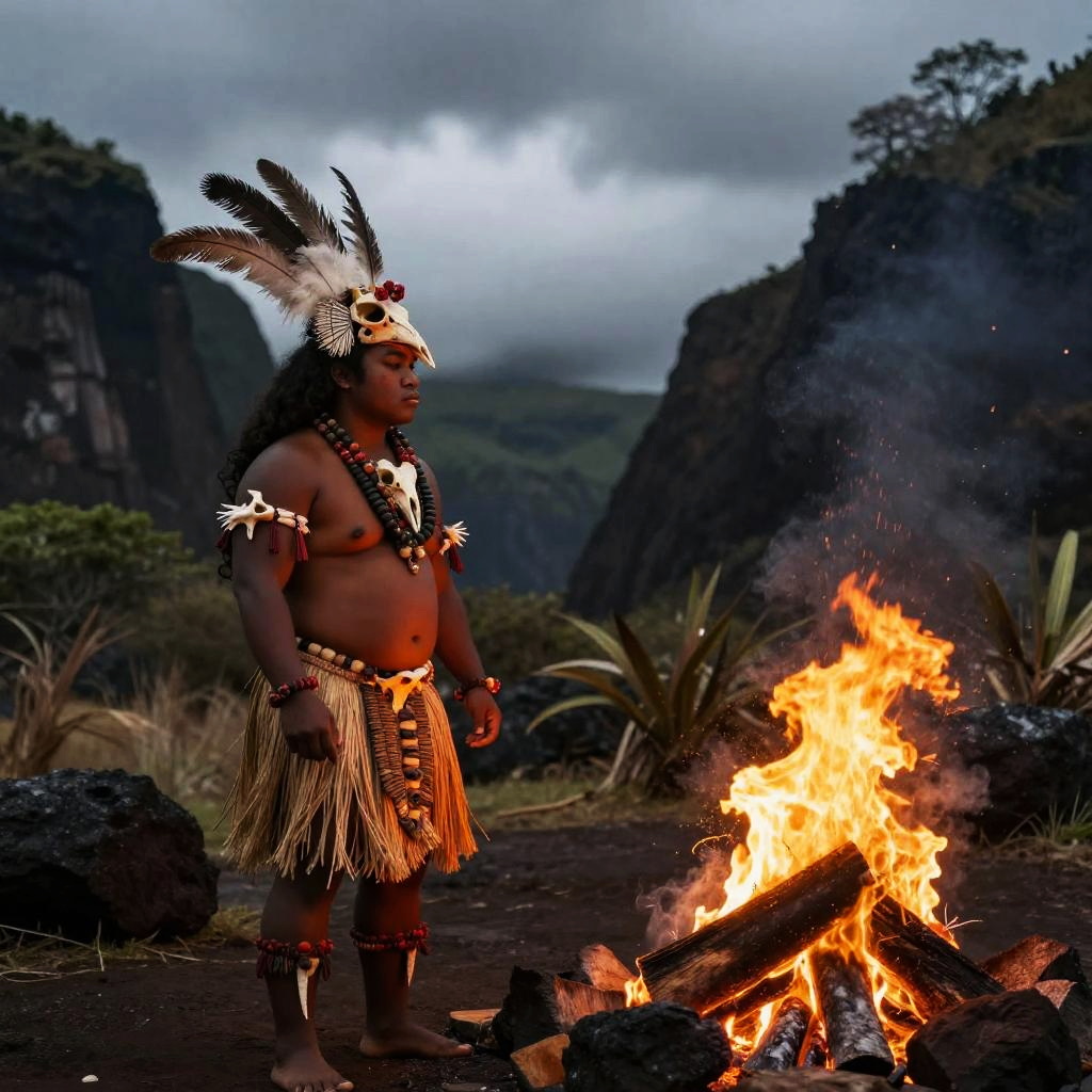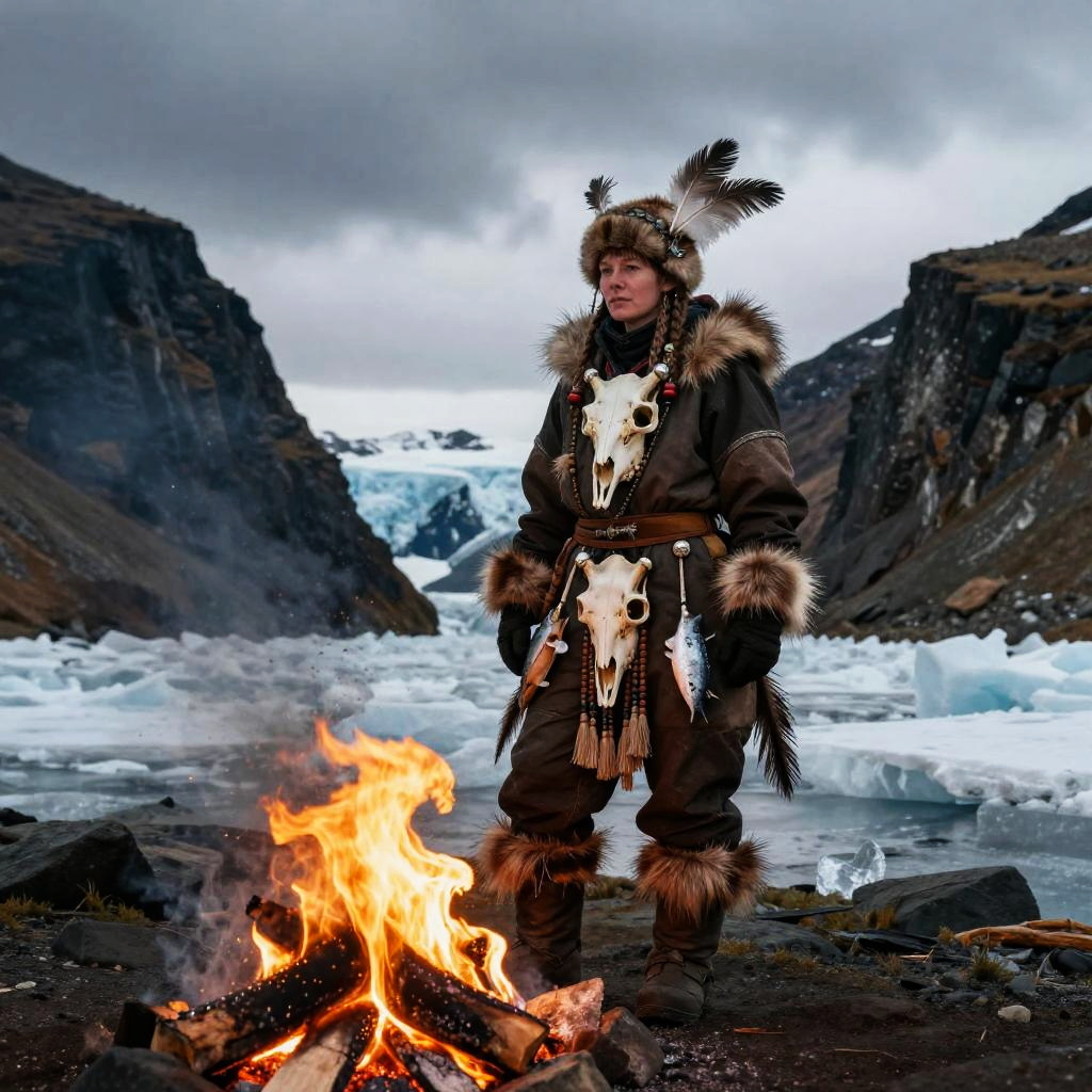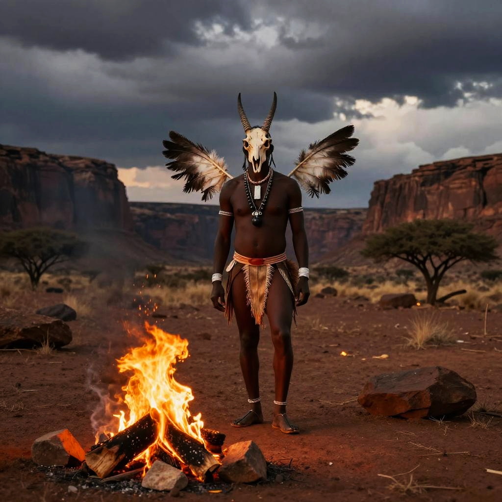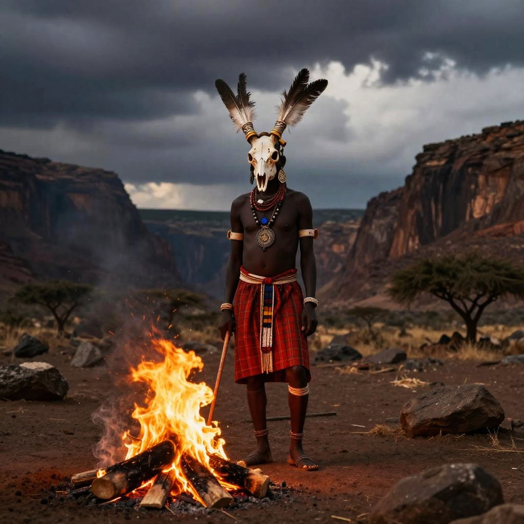 Quechua mountain healer wearing animal bones and large feathers, standing by a smoking fire in a dark cloud canyon landscape, volumetric lighting, 8k, photorealistic, wide angle