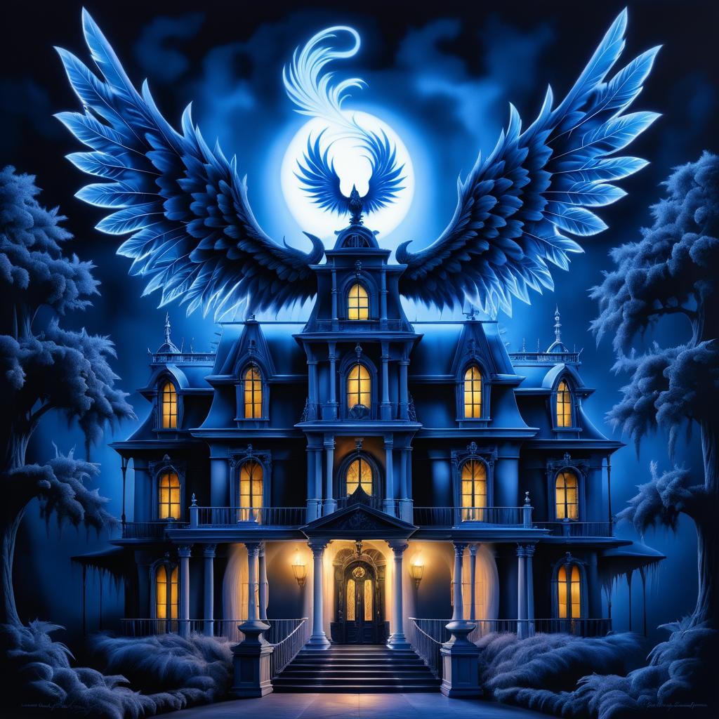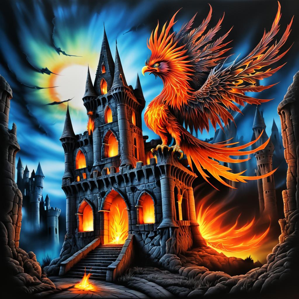 Airbrush drawing of a crumbling castle, featuring a hybrid Phoenix-Zombie with fiery feathers, hyper-realistic with torchlight.
