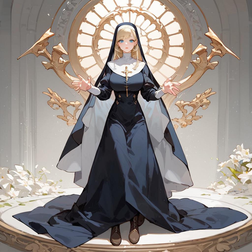 Score_9, score_8_up, score_7_up, score_6_up, score_5_up, score_4_up, source_anime, masterpiece, best quality, ultra quality, emiliana, blonde hair, long hair, blue eyes, nun, habit, blue long dress, frontal view, looking at viewer, brown boots, full body, surprised, black pantyhose, five fingers