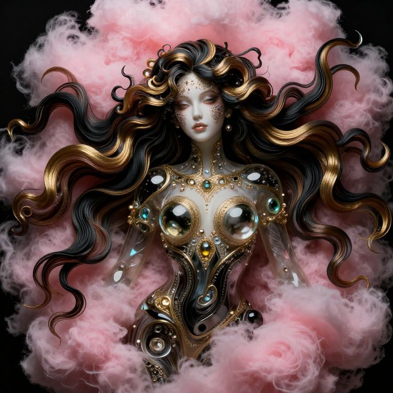 The image presents a stunning interpretation of a female form, meticulously crafted from a blend of cotton candy and glass, exuding a delicate yet intricate beauty. Her flawless face is adorned with delicate, glittering details, while her flowing long hair, a mesmerizing mix of black, gold, bronze, and pink hues, cascades around her, creating a sense of depth and dimension. The texture of the cotton candy is soft and fluffy, contrasting with the smooth, reflective surface of the glass, which adds a layer of complexity to the composition. The overall color palette is rich and vibrant, with shades of black, gold, and pink dominating the scene, creating a luxurious and elite atmosphere. The image is a hypermaximalist masterpiece, with intricate details and a cinematic quality, reminiscent of the work of Ernst Haeckel and Charles Audubon. The composition is masterfully arranged, with the female form centrally positioned, surrounded by a halo of cotton candy and glass, creating a sense of harmony and balance. The interplay of colors, textures, and shapes creates a haunting and ominous effect, adding to the overall impact of the image.
