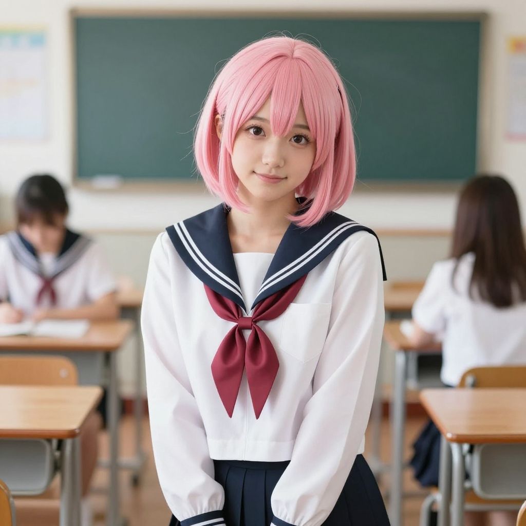 Anime-style digital illustration of a cute girl with pink bob-cut hair, purple eyes, and a navy blue sailor school uniform, smiling softly in a brightly