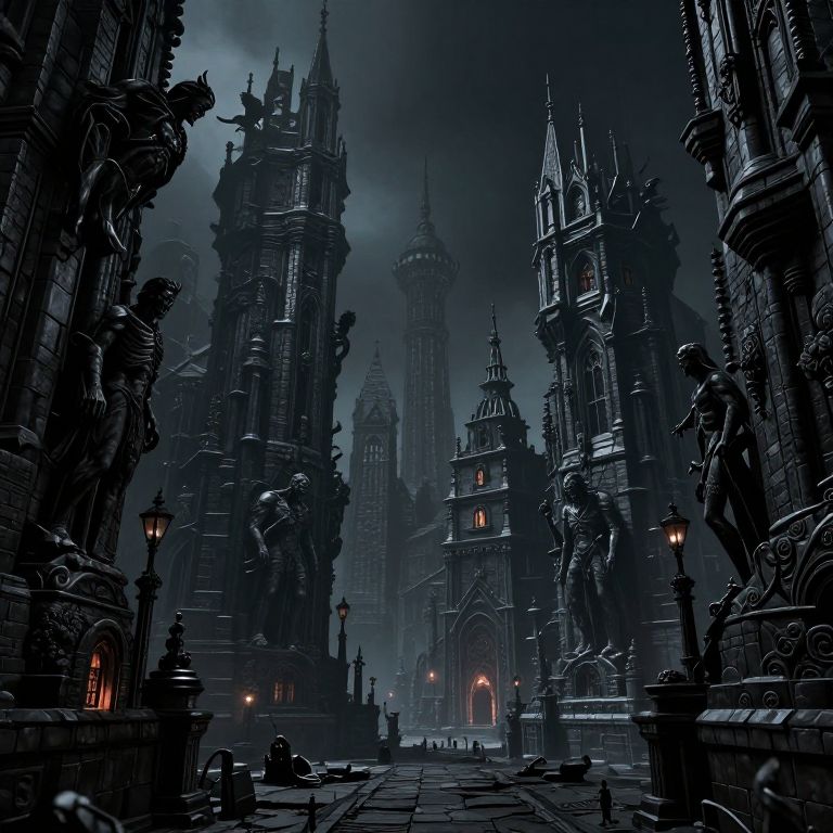 An eerie, gothic cityscape underground, constructed from black stone, features towering, monstrous statues and intricate, dark stone buildings, bathed in a horror-inspired, octane-rendered light, reminiscent of the art styles of Brom, Whelan, Giger, Beksinski, Aly Fell, Rutkowski, Art Germ, Rossdraws, and Franzzeta, all rendered in an ultra-detailed, cinematic scene with smooth, sharp features and a focus on illustration.