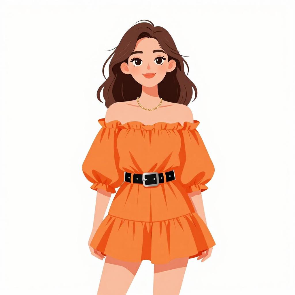 This digital illustration features a young woman with fair skin and long, dark brown hair. She wears an off-the-shoulder, bright orange dress with puffed sleeves and a belt cinched at the waist, accentuating her slim figure. Her dress has a flared skirt that ends mid-thigh. She has large, expressive brown eyes, a small nose, and a gentle smile. She also wears a simple gold necklace. The background is plain white, making her the focal point. The style is reminiscent of anime or modern cartoon art, with clean lines and vibrant colors.