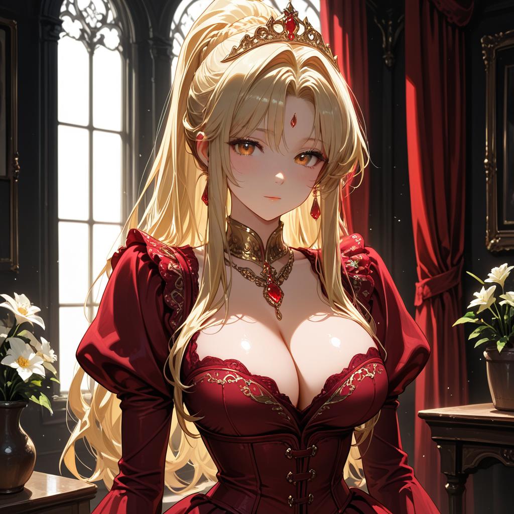 High-quality digital artwork of an anime-style female pirate character with red twin-tail hair and heterochromia (red and yellow eyes). She is dressed in a detailed red and black pirate-inspired outfit including a bicorne hat with feather, cropped and sleeveless red jacket over a white leotard with a leather belt, black thigh-high stockings, white gloves, frilled choker, and red ascot. The character poses confidently in an elegant room with soft lighting from a large window in the background.