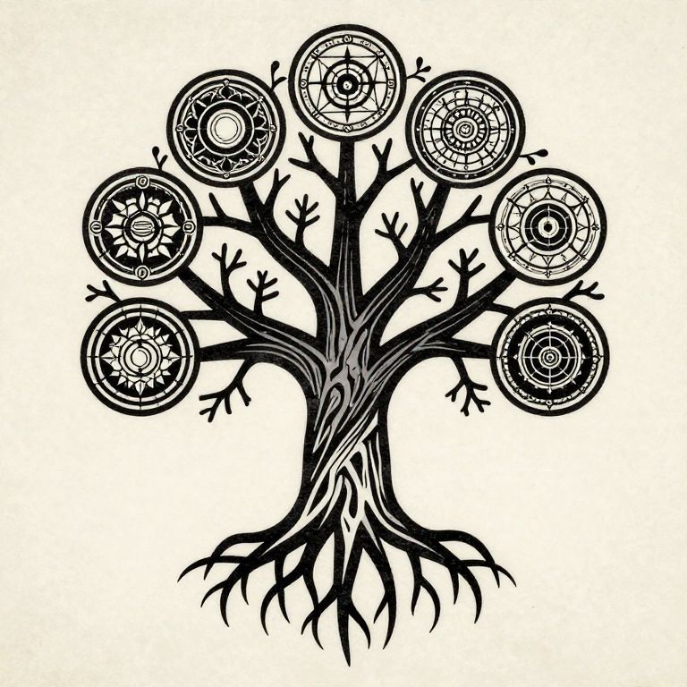 Black and white digital drawing of a stylized tree with a thick, gnarled trunk and intricate branch patterns. The tree has six circular, ornate designs resembling mandalas or Celtic knots at the ends of its branches. The branches are thin and extend outward, with detailed line work creating a textured, almost tribal appearance. The roots spread out from the base of the trunk, adding to the complex structure. The background is plain white, highlighting the stark contrast and detailed black ink work of the tree. The overall style is reminiscent of traditional tattoo art.