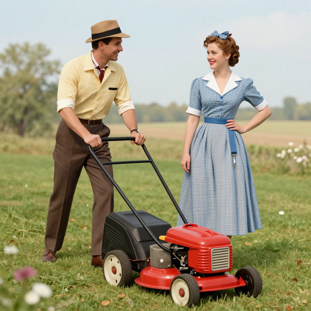 A vibrant vintage illustration depicts a retro-styled couple engaged in lawn care, with the man operating a classic red push mower while the woman stands beside him, dressed in a charming period outfit, set against a pastoral backdrop with soft lighting and delicate floral accents.