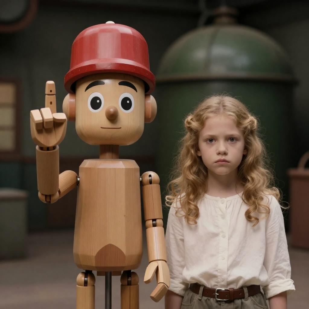 Photograph of a wooden puppet with a red hat, large eyes, and raised index finger, standing beside a young girl with curly blonde hair, white blouse, and brown belt. Background features dimly lit industrial setting with a green dome. Puppet's face is neutral, girl's expression is serious. Both figures positioned in the foreground.
