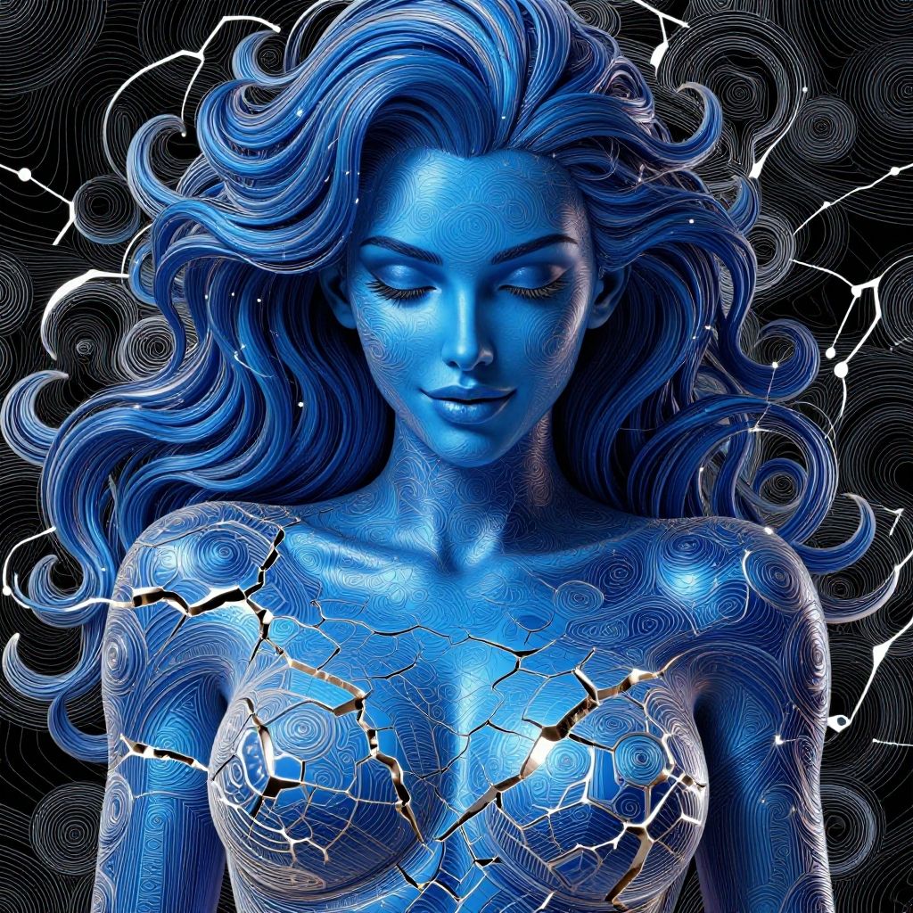 Digital art of a blue-toned, topless woman with flowing hair, crackled patterns on her chest, and a dark, wavy background.